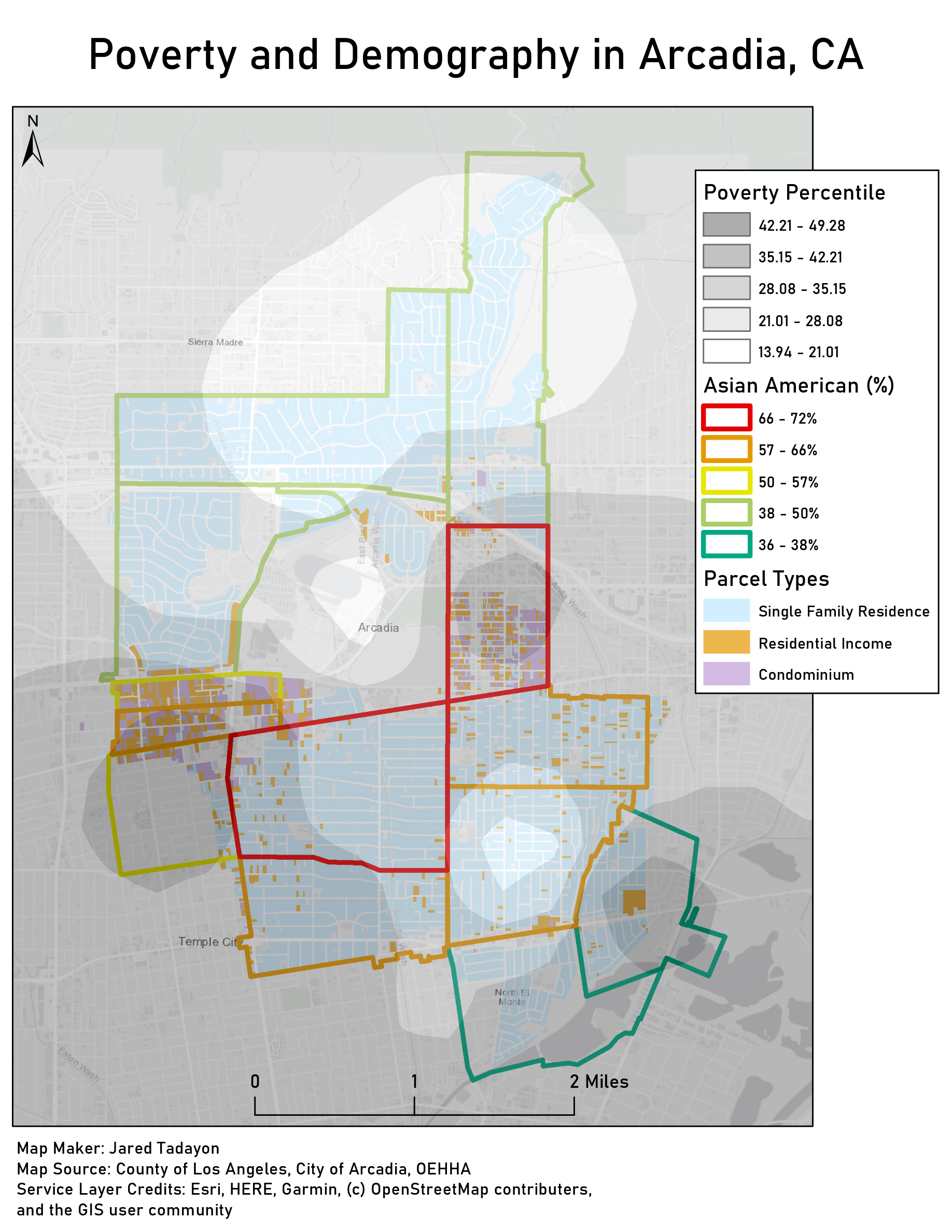 The first map visualizes the poverty percentile of each census block in Arcadia, the type of homes by parcel, and the percentage of Asian Americans who live in each census block. The first layer that I found was a shapefile of Arcadia by parcel type. It was made by the City of Arcadia. Using a definition query, I only kept “Single Family Residence”, “Residential Income”, and “Condominium”. On the CalEnviroScreen website, I found the recently published OEHHA, The Office of Environmental Health Hazard Assessment. I inserted their available shapefile onto the map, and duplicated it. To show the percentage of Asian Americans in each census block of Arcadia, I used a definition query to limit the space to the city’s boundaries. By utilizing the Symbology tool (graduated colors) to show the demographics through a colorful border, it was kept hollow so the parcels could remain visible. The duplicate of the OEHHA shapefile was used to display the poverty percentile. After restricting it to Arcadia, the Feature to Point tool in the Database Management section of the ArcToolbox came in handy. I then used the IDW tool in the Spatial Analyst section to display the poverty percentile. In order for the other layers to be visible, I changed the color of the Poverty Percentile layer to Black-White and raised transparency. A gray basemap was added to show the surrounding area and neighboring cities.