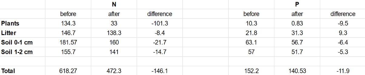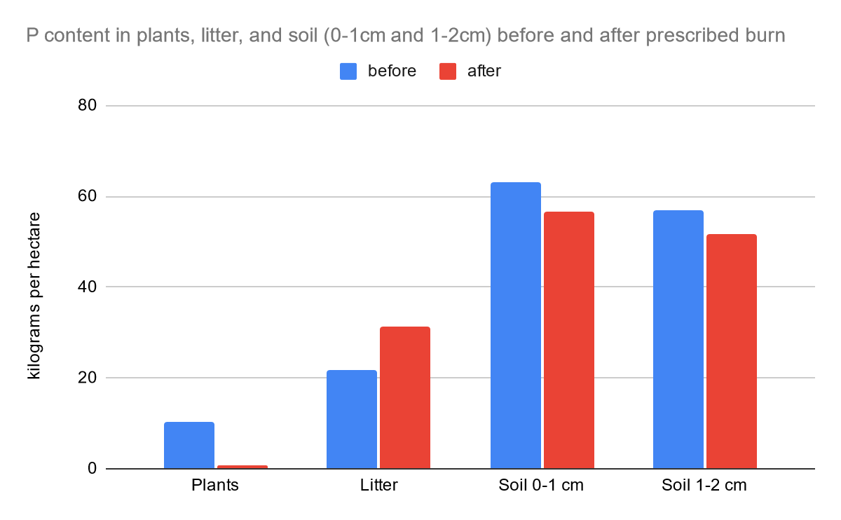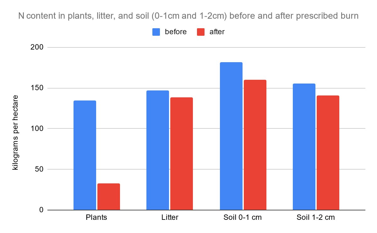 The pre- and post-fire field collection of nitrogen and phosphorus on soils, plants, and plant litter will be conducted simultaneously over the span of two days. In order to study the levels of ammonium and nitrate, we will keep track of the content levels over the course of one year. After the first round of field collection, we will prescribe a controlled burn to the given plots of land that we have determined to use. All nitrogen and phosphorus content will be measured in kilograms per hectare, while ammonium and nitrate will be measured in micrograms of nitrogen per gram of oven-dry soil. Due to differences in flammability, vegetation will be separated by (1) live twigs (2) live stems and (3) dead twigs and stems (De Bano and Conrad 1978). Distinguishing between such is important for the purpose of maintaining the accuracy of the experiment. Plant litter will be sampled through a field study technique that applies randomness over the span of a hectare. Soil will be collected at the O horizon (humus) at depths between 0 to 1 cm and 1 to 2 cm. It will be sampled at locations where plant litter exists.