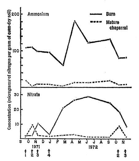 The chart above was provided by Rundel (1983). This is helpful for our research in the nitrogen cycle because nitrate and ammonium are key nutrients. It is clear that the level of ammonium and nitrate are low in chaparral ecosystems as mature adults. When the fire begins, the level of ammonium immediately increases, and the level of nitrate is bell-shaped in the increase and decrease.